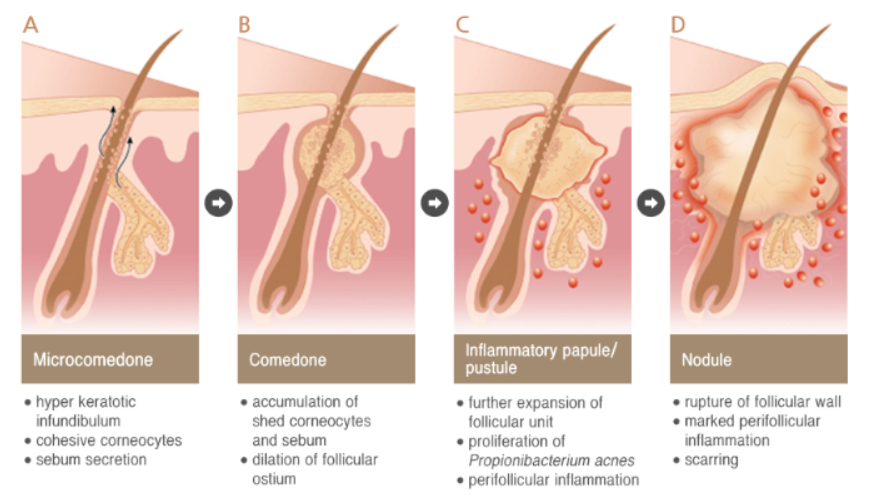A단계는 미세면포라고 합니다. 모낭 표피 세포가 증식하고 딱딱해지기 시작합니다. 그렇게 되면 정상적인 피지 배출이 막히겠죠?
